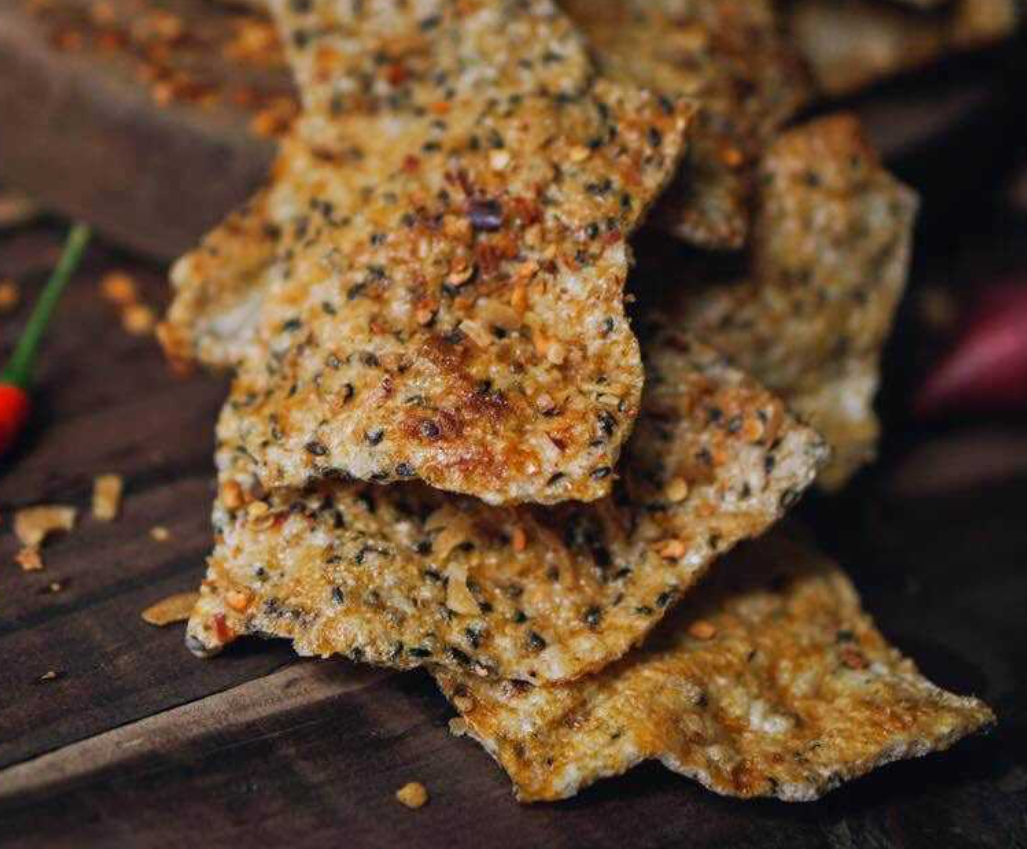 Thêm vào đó, là sự hoà quyện bột gạo với nước cốt dừa, mè đen hoặc mè trắng tỷ lệ chính xác, nâng tầm hương vị bánh tráng nguyên bản lên tầm cao mới, vừa giòn, vừa thơm, vừa beo béo khác lạ, chỉ nướng bánh thôi ăn đã mắc ghiền.